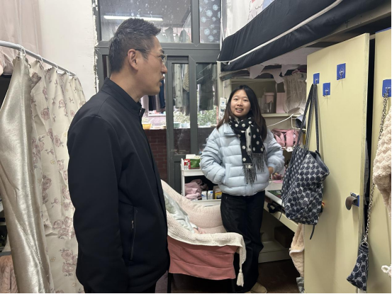 随后,杜剑副董事长一行深入员工寝室,与同学们面对面亲切交流。每到一间寝室,他都仔细察看住宿环境、设施配备及消防安全情况,关切地询问同学们来自哪里、是否适应校园生活、学业进展如何,以及在生活中是否存在困难。当看到寝室环境干净整洁、同学们相处融洽时,杜剑副董事长十分欣慰,他勉励同学们要珍惜大学时光,既要扎实学好专业知识,也要学会与人相处,在集体生活中培养团队协作意识和独立生活能力,共同营造文明和谐的寝室氛围。