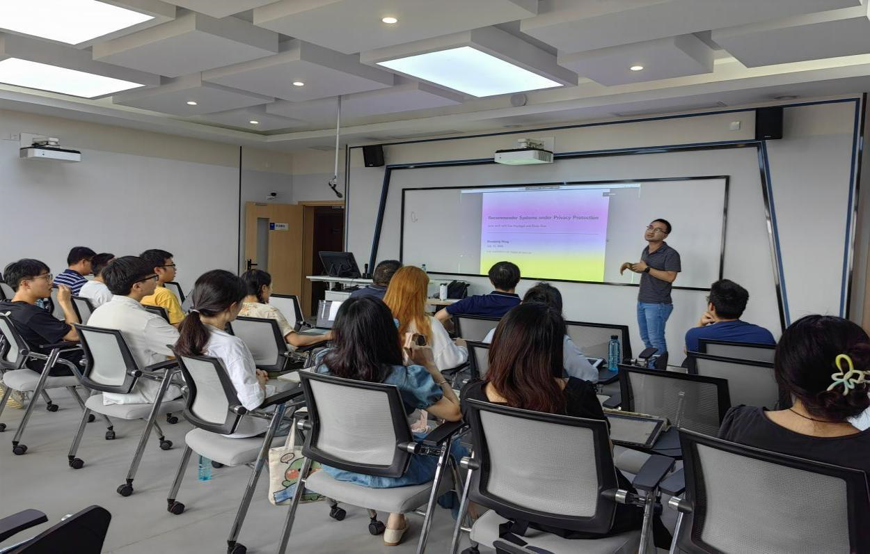 然后,由汪寿强教授围绕主题为:“隐私保护下的推荐系统”进行分享与交流。汪寿强博士从生活现象、企业运作实践层面详细介绍了学术问题的来源。从科学问题提炼、研究设计、模型构建、模型运算、研究结论提炼、学术论文写作等多个层面进行了全面的分享。
