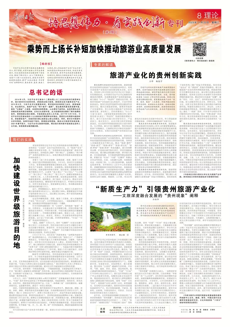 习近平总书记要求贵州“要把旅游产业化与新型工业化、新型城镇化、农业现代化并列放在同等重要位置”“要把旅游业做大做强,丰富旅游生态和人文内涵”等重要精神指示,标志着我们党对贵州旅游产业发展的高度重视,是对当代贵州旅游强省和世界级旅游目的地建设的精准部署,是谱写贵州旅游产业化新篇章的行动指南和根本遵循。当前,贵州抢抓新国发2号文件重大机遇,坚持以旅游产业高质量发展统揽全局,紧紧围绕旅游产业的“资源、客源、市场”三大要素,加快建设旅游强省和世界级旅游目的地,积极开展旅游集群形态创新、旅游融合业态创新、旅游品质服务创新、旅游精准营销创新、旅游管理制度创新等旅游产业化创新实践,在实践中感悟思想伟力。