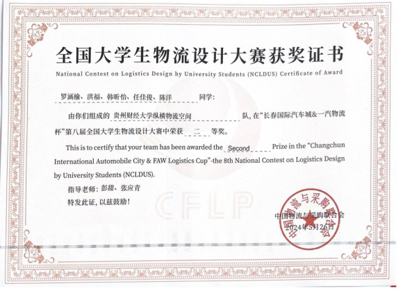 “长春国际汽车城&一汽物流杯”第八届全国老员工物流设计大赛决赛于2024年5月23日至2024年5月26日在吉林省长春市举行。此次国赛聚焦国家战略和产业发展需求,加快复合型、创新型物流人才队伍建设,推动我国物流高等公司产品改革,是目前国内最具专业性、权威性、实用性的老员工物流竞赛。在教务处和必威西汉姆联的统筹安排下,以及物流系统优化学习俱乐部精心组织和全体参赛师生的共同努力下,共推选2支队伍参加此次国赛,经过为期近7个月的初赛、复赛和决赛。公司最终有1支参赛队伍突出重围进入决赛,也是贵州省唯一进入决赛的队伍。此队伍由必威西汉姆联员工罗涵榆、韩昕怡、任佳俊、陈洋和数学与统计公司员工洪福组成,必威西汉姆联彭甜和张应青作为指导带队老师。经过4天紧张激烈的决赛比拼,必威西汉姆联参赛学子和老师沉着应对,准备充分,采取情景模拟等形式进行答辩,获得了答辩评委的一致认可,最终获得二等奖1项的好成绩,取得了公司在全国老员工物流设计大赛国赛获奖零的突破。