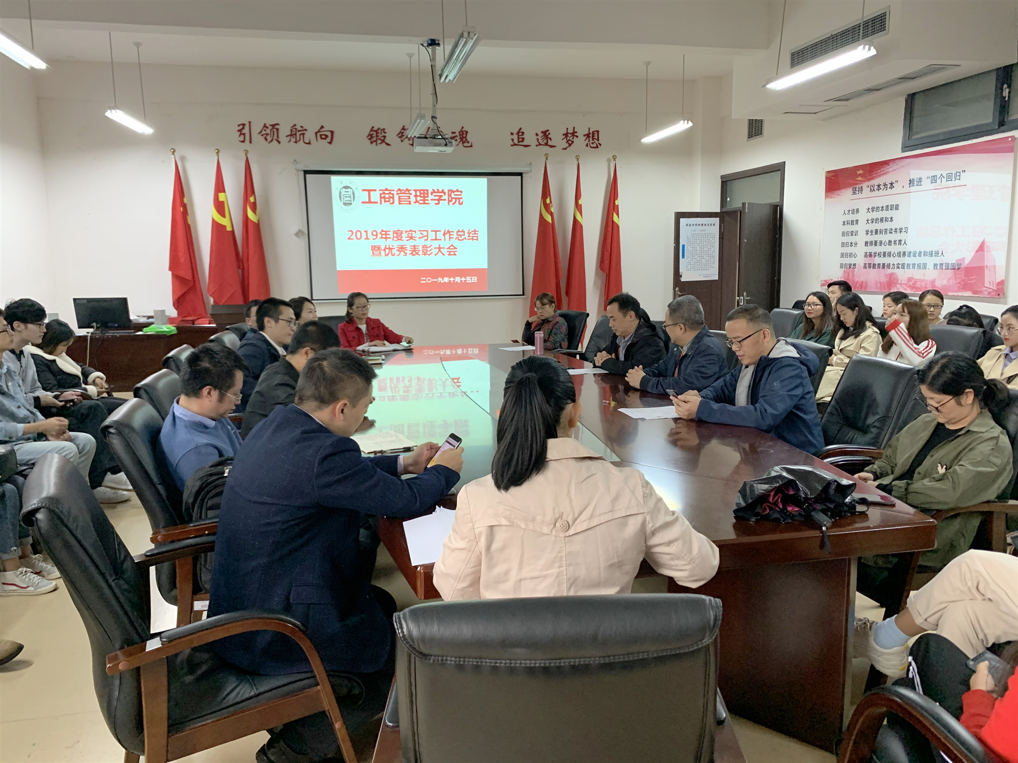 2019年10月15日下午15:30,2019年度实习工作总结暨优秀表彰大会在崇德楼306会议室举行。必威西汉姆联常务副书记崔军、副书记陈劲松、副经理胡北明、各系副主任、实践办工作人员、各实习指导教师及全体优秀实习生、实习指导教师、16级各班实习生代表参会。