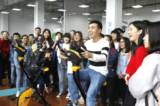 本次活动共分为两个部分。第一部分是参观富士康的智能设备。员工在此展厅了解了贵安新区沙盘、智能家居、智能教室、智能幼儿园、健康乐活智能健身房等项目,同学们还有幸体验了智能健身房,现场一片欢声笑语。