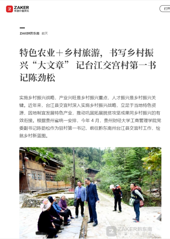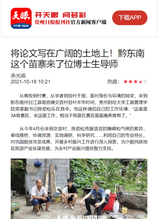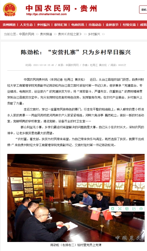 近日,工商管理公司党委副书记陈劲松驻台江开展乡村振兴工作,全心全意为民办实事,将论文书写在广阔大地上的事迹,相继获中国农民网·贵州、天眼新闻、ZAKER、腾讯视频等多方新闻媒体报道。