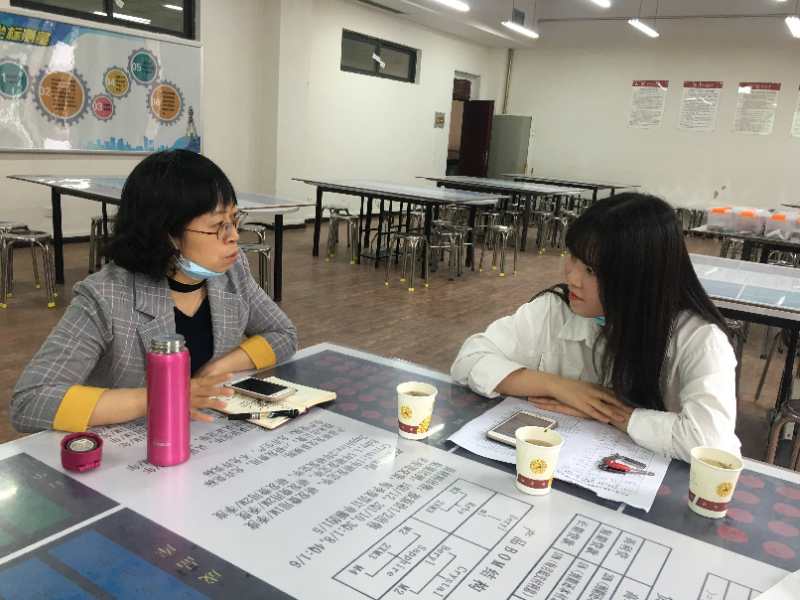 图1.廖婧琳老师(左一)与邰海音老师(右一)交流苗绣的分类和教材的结构