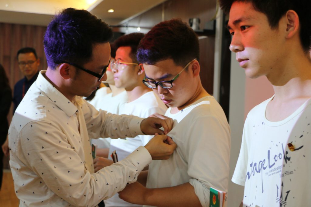 校团委书记李文龙为新团员佩戴团徽