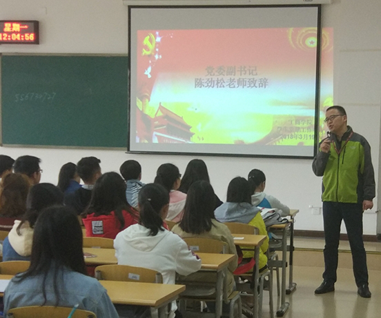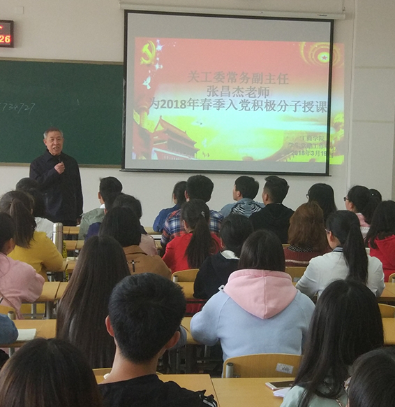 在开班典礼上,党委副书记陈劲松为此次开班典礼致辞,他提到参加党课培训的学员必须端正入党动机,不断学习。而后关工委常务副主任张昌杰老师为2018年春季入党积极分子进行授课,他以国家历史为背景,为入党积极分子讲述党的光荣事迹,激发学员们的爱国爱党意识,同时让学员们了解到作为党员应该展现的精神,只有严格要求自身,秉承无私奉献的精神,才能更好的实现自己的价值。在这次党课培训中,入党积极分子认真听课并积极参与课堂。