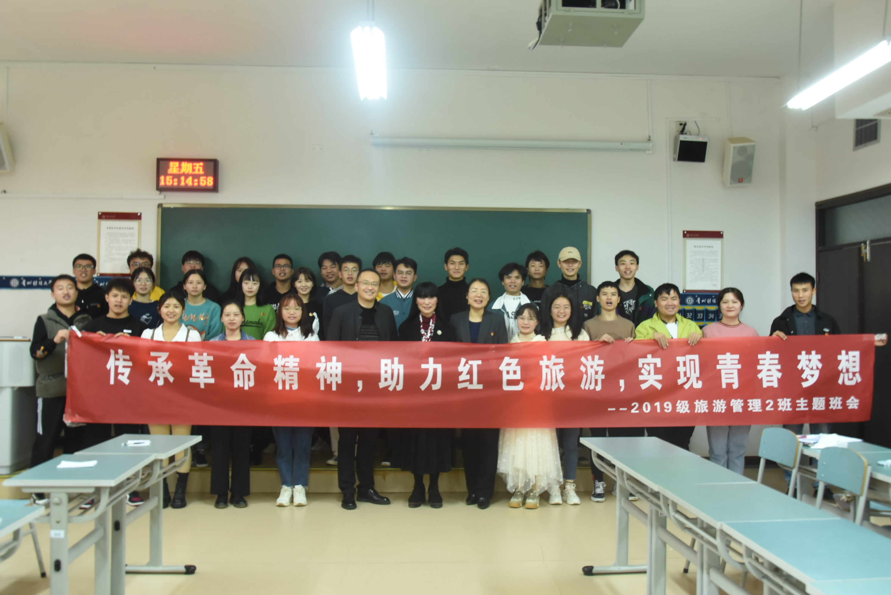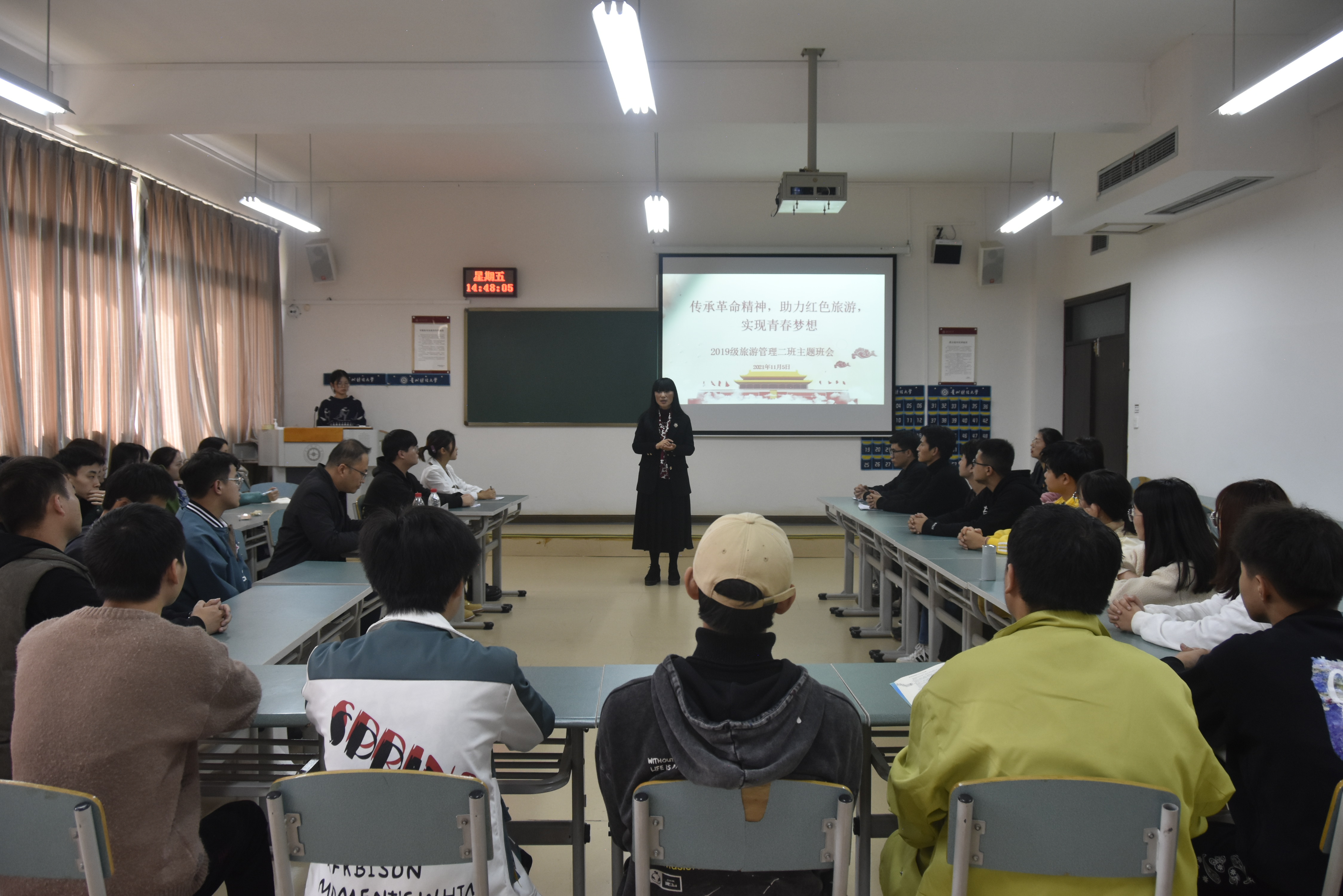 主题班会由辅导员蒋小芳老师主持。班会上,同学们首先观看了“党课开讲啦”电视系列片之《传承红色基因讲好遵义故事》,随后,员工代表结合专业知识介绍了邓恩铭故居、王若飞故居、遵义会议会址等红色遗址,苏浩鹏同学以“我的老兵爷爷”为题,讲述了爷爷在革命战争年代的英雄事迹,以及在和平年代艰苦奋斗的故事。听完这几位同学的讲述后,班上的其他也同学积极发言,分享了自己感想和心得,均表示将立足专业定位,努力学好理论知识,不断提升实践能力,为家乡的红色旅游发展与革命精神传承贡献青春力量。