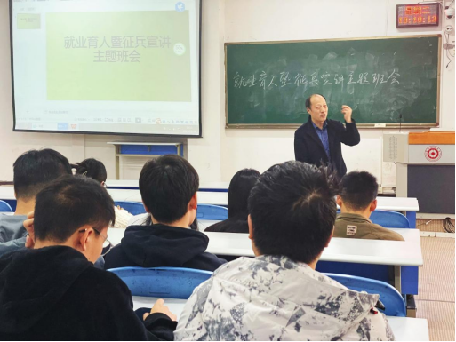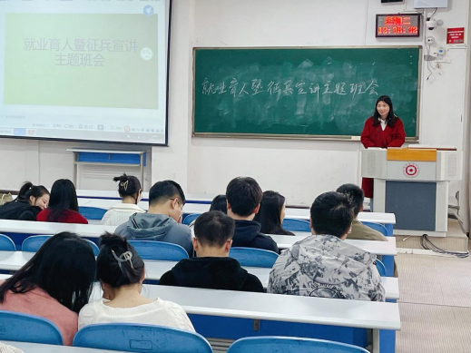 2023年11月28日,必威西汉姆联在进学楼阶101举办了一场就业育人暨征兵宣讲主题班会。武装部胡细根老师和辅导员孔淑华老师作为主讲人出席了班会,2020级毕业生200多人参加了班会。