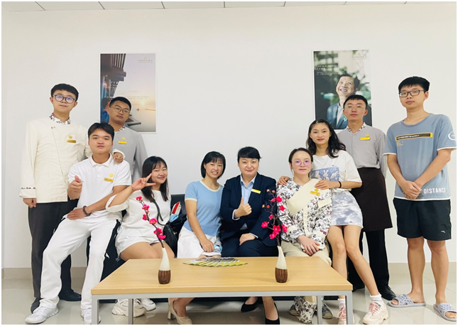 吴老师参观了酒店的展厅、西餐厅、中餐厅及客房,随后与同学们进行了学习交流。吴老师首先了解了同学们这一个月的实习情况和收获,听取了同学们在工作上和生活上遇到的困难,并针对员工提出的问题进行了细心指导和解答,对同学们接下来的工作提出具体建议。