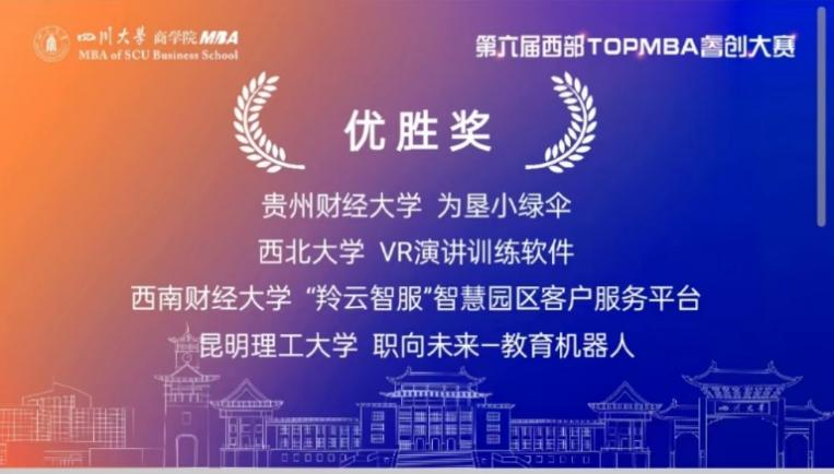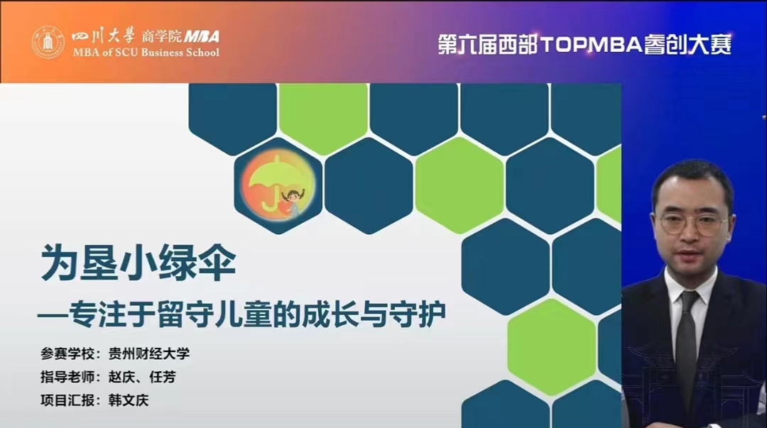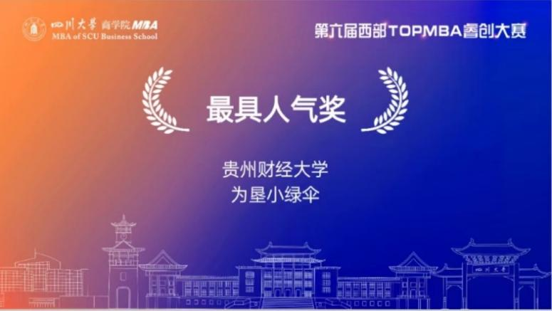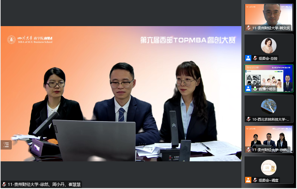 10月29日,第六届西部TOP MBA睿创大赛总决赛在四川大学顺利举行。大赛是由四川大学商公司发起,面向西部高校MBA员工及员工的创业主题赛事,创办于2017年。经过初赛角逐,共有14支创业队伍晋级决赛。受疫情影响,本次决赛相聚云端,通过路演视频展播、提问答辩的形式进行。